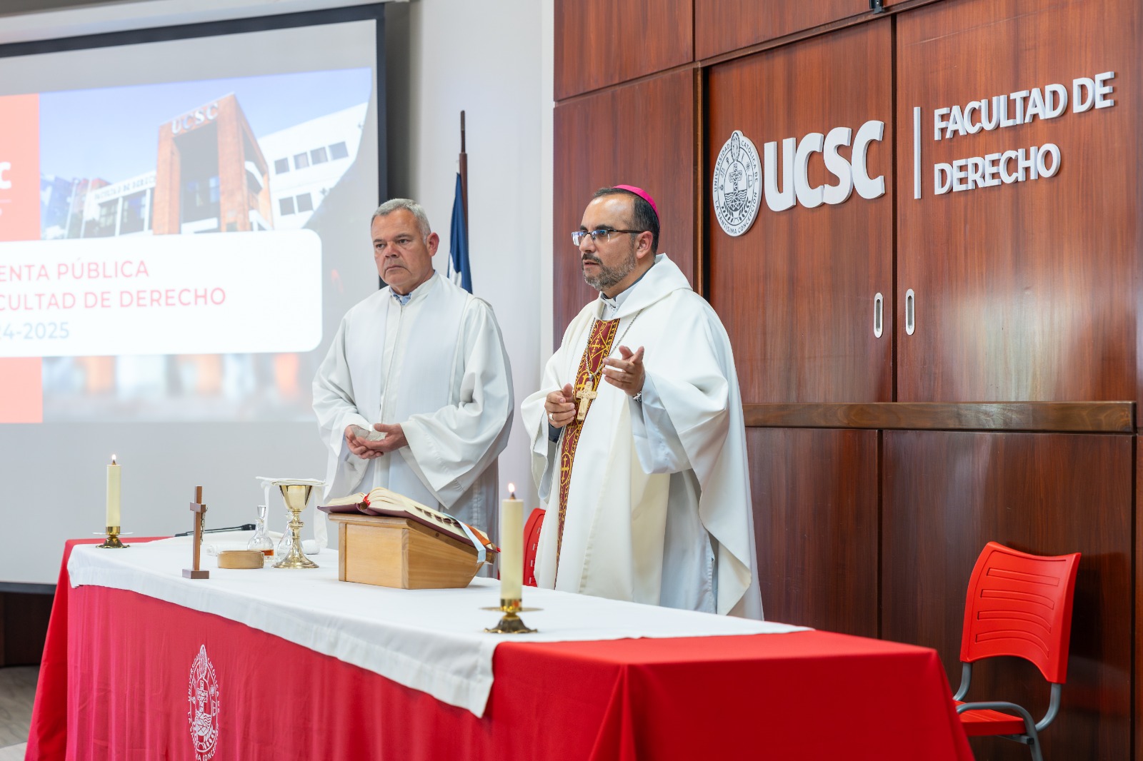 En el marco de su 49° aniversario, la Facultad de Derecho celebró su Cuenta Anual de Gestión 2024-2025. El encuentro fue presidido por el Vice Gran Canciller de la UCSC y Obispo Auxiliar de Concepción, Monseñor Bernardo Álvarez Tapia, y contó con la presencia de autoridades superiores de la universidad, el Seremi de Justicia y DDHH Carlos Uslar, autoridades de la Facultad, académicos, administrativos y estudiantes.